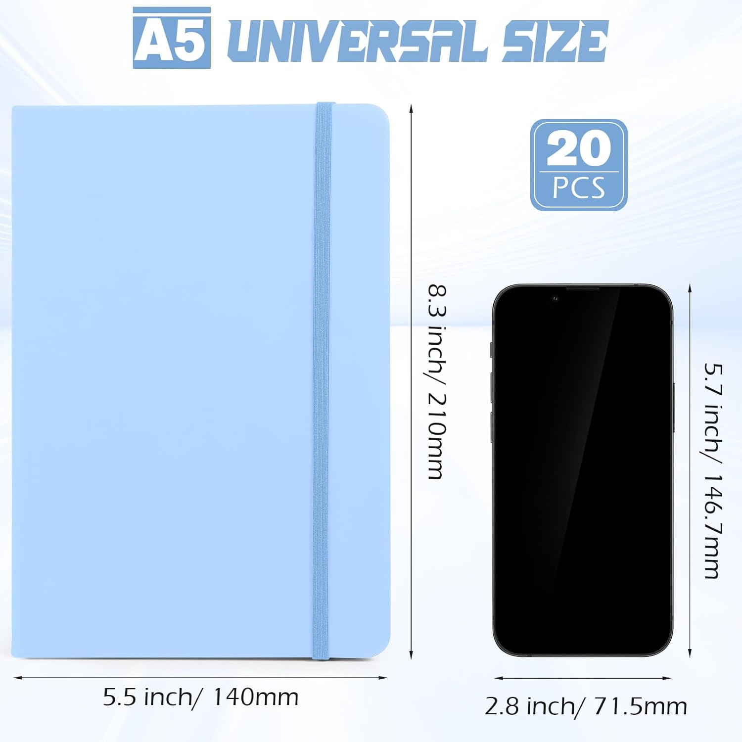 20 Pack Lined Journal Notebooks A5 Hardcover Executive Notebook 5.5″ x 8.3″ PU Leather Wide Ruled Journals Bulk with Elastic Band for Home Business Office School Supplies(Light Blue)